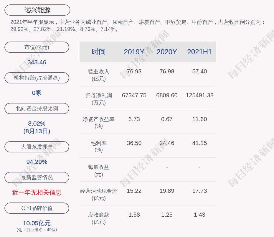 2021年半年报显示,远兴能源的主营业务为碱业自产、尿素自产、煤炭自产、甲醇贸易、甲醇自产,占营收比例分别为:29.92%、27.82%、21.19%、8.73%、7.14%。