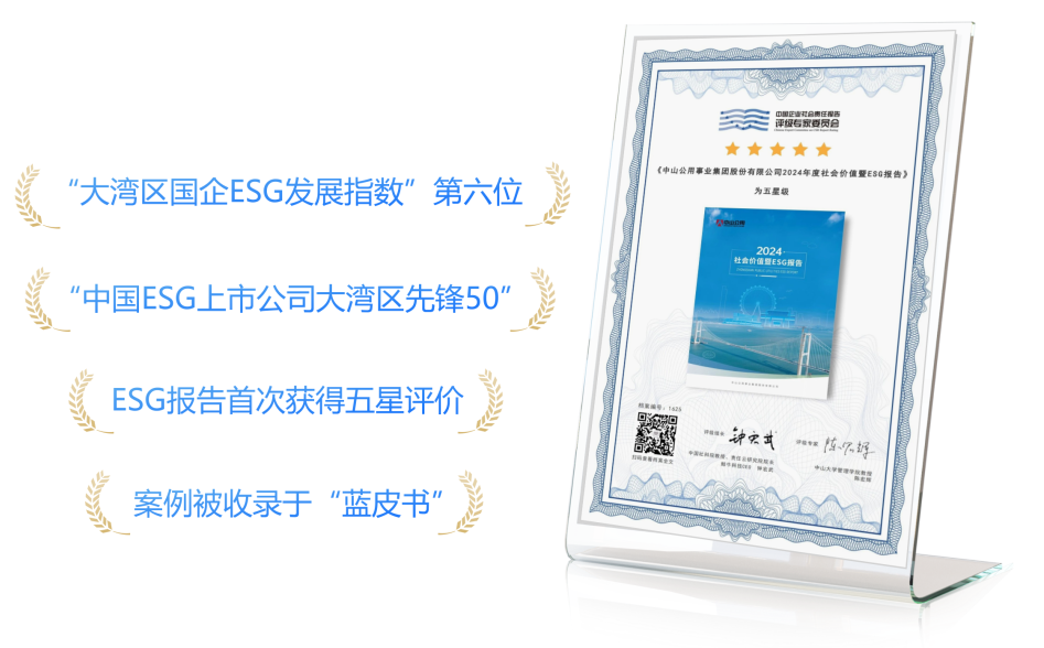 今年,公用集团ESG报告更是首次获中国企业社会责任报告评级专家委员会五星级评价,报送的案例《打造完整生态环境服务产业链,深入推进绿美中山生态建设》被收录于《粤港澳大湾区国有企业社会价值蓝皮书(2025)》,作为大湾区国有企业推动社会价值实现的典型实践进行推广。