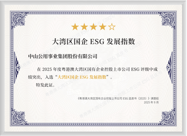 在中国企业改革与发展研究会发布的“大湾区国企ESG发展指数”中,公用集团位列第6,较去年提升1名,并连续3年稳居“中国ESG上市公司大湾区先锋50”榜单,突出表现了在ESG实践中的行业示范作用。
