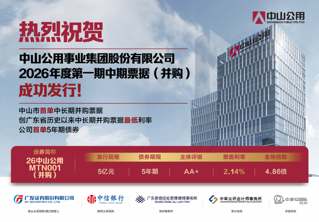 2026年1月15日,中山公用事业集团股份有限公司在银行间债券市场成功发行2026年度第一期中期票据。本期票据发行规模5亿元,期限5年,票面利率2.14%,全场认购倍数达4.86倍,受到市场热烈追捧。本期债券是公司首单5年期债券,中山市首单中长期并购票据,并创广东历史以来并购票据利率新低,彰显了市场对公司综合实力与发展前景的高度认可。