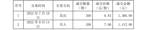 具体来看,2022年7月18日卖出200股,成交价6.83元/股,金额1,366元;9月14日买入200股,成交价7.06元/股,金额1,412元。