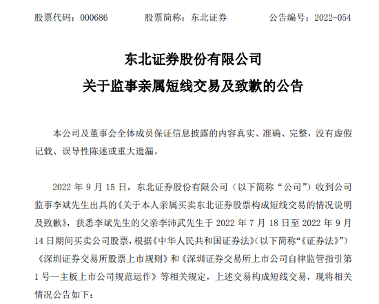 原来,东北证券于2022年9月15日收到监事李斌先生出具的《关于本人亲属买卖东北证券股票构成短线交易的情况说明及致歉》,获悉其父李沛武先生于2022年7月18日至2022年9月14日期间买卖公司股票,构成短线交易的情况。