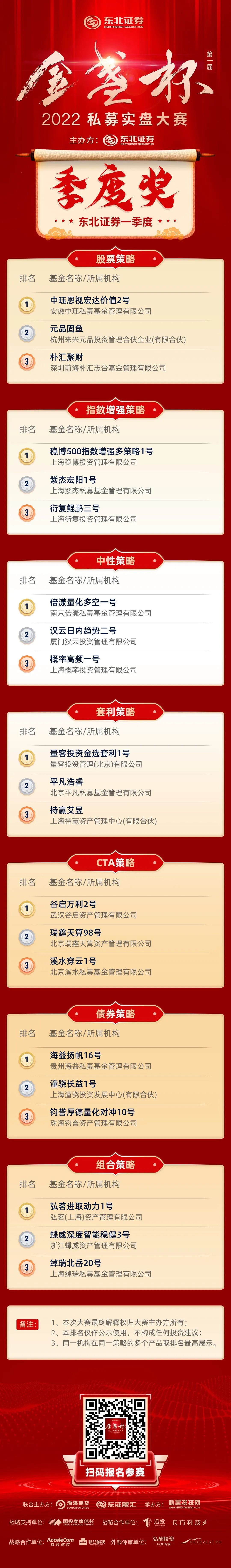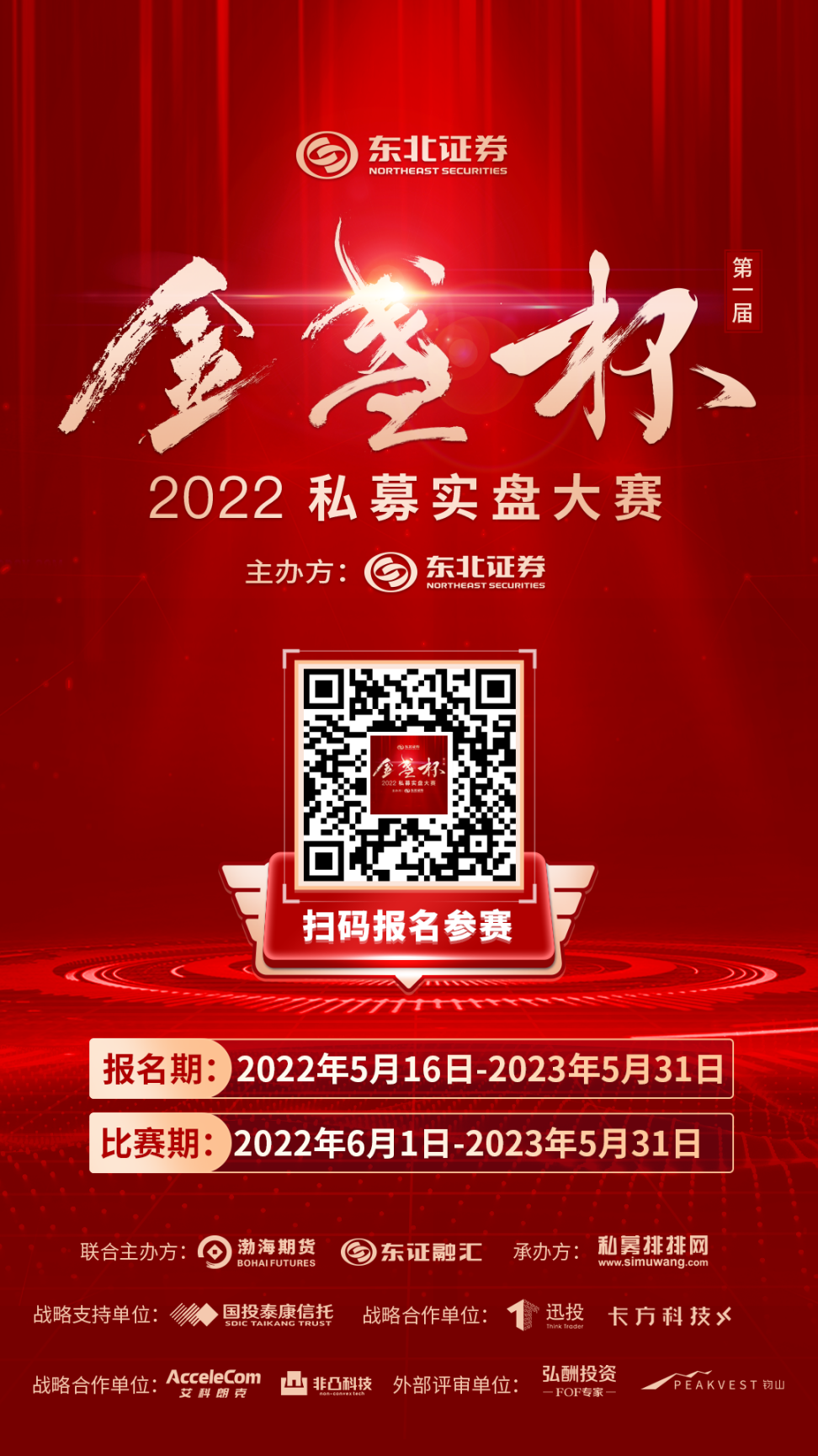 为推动私募行业的高质量发展,赋能优秀私募管理人成长,东北证券联合渤海期货、东证融汇、私募排排网、国投泰康信托、迅投、卡方科技、艾科朗克联袂打造出全国性私募赛事——东北证券2022年第一届“金盏杯”私募实盘大赛,为私募管理人提供公平公正的比赛平台。