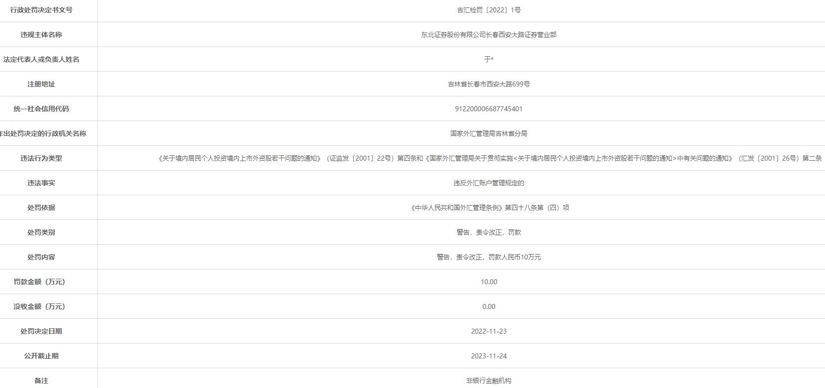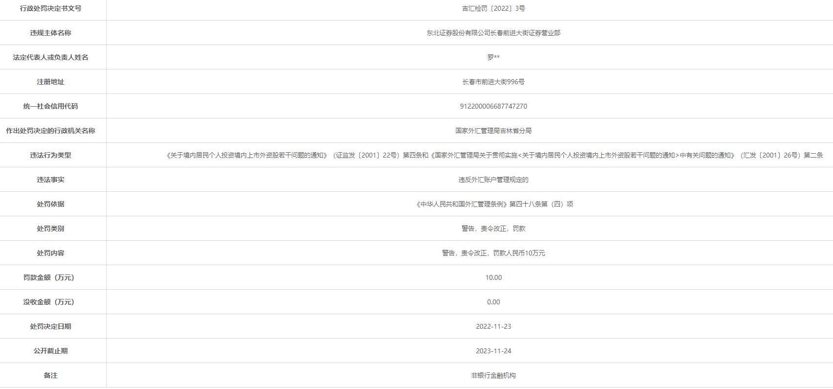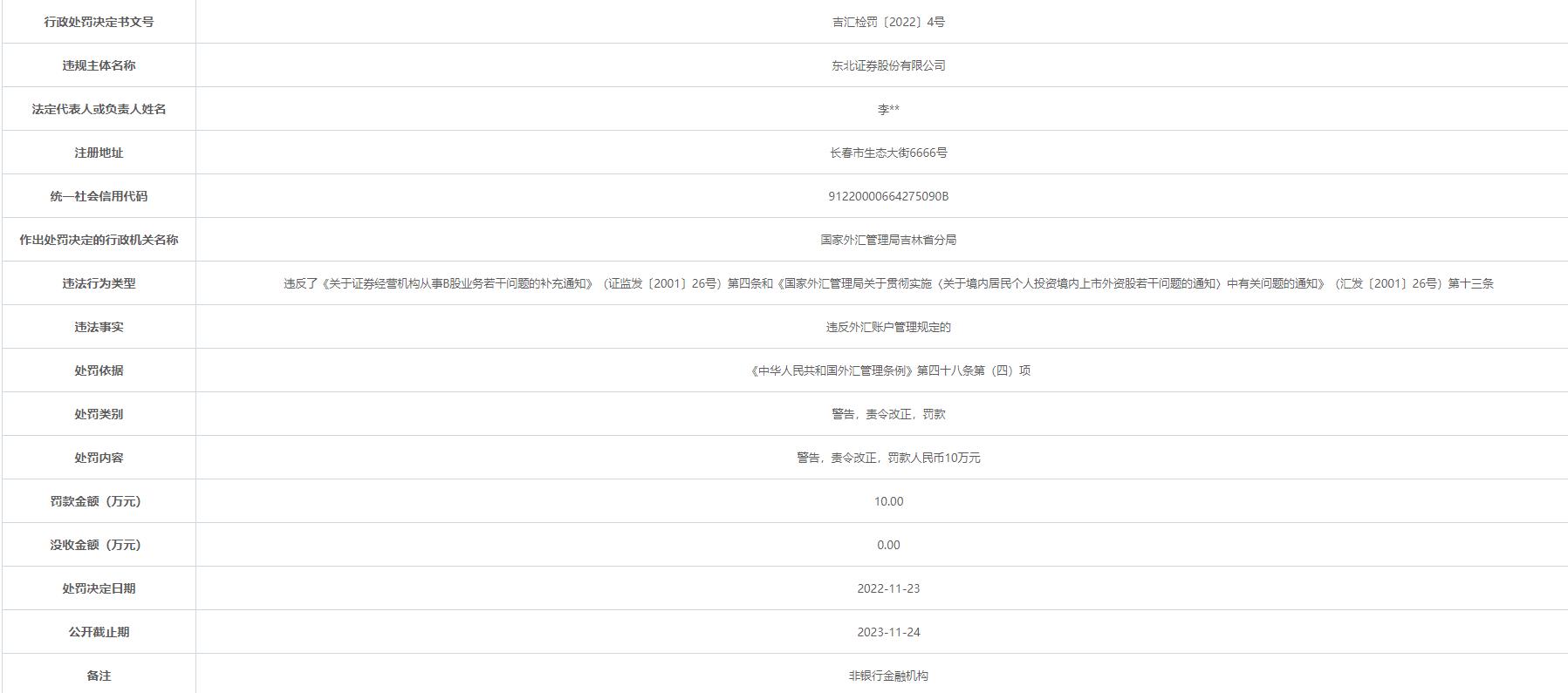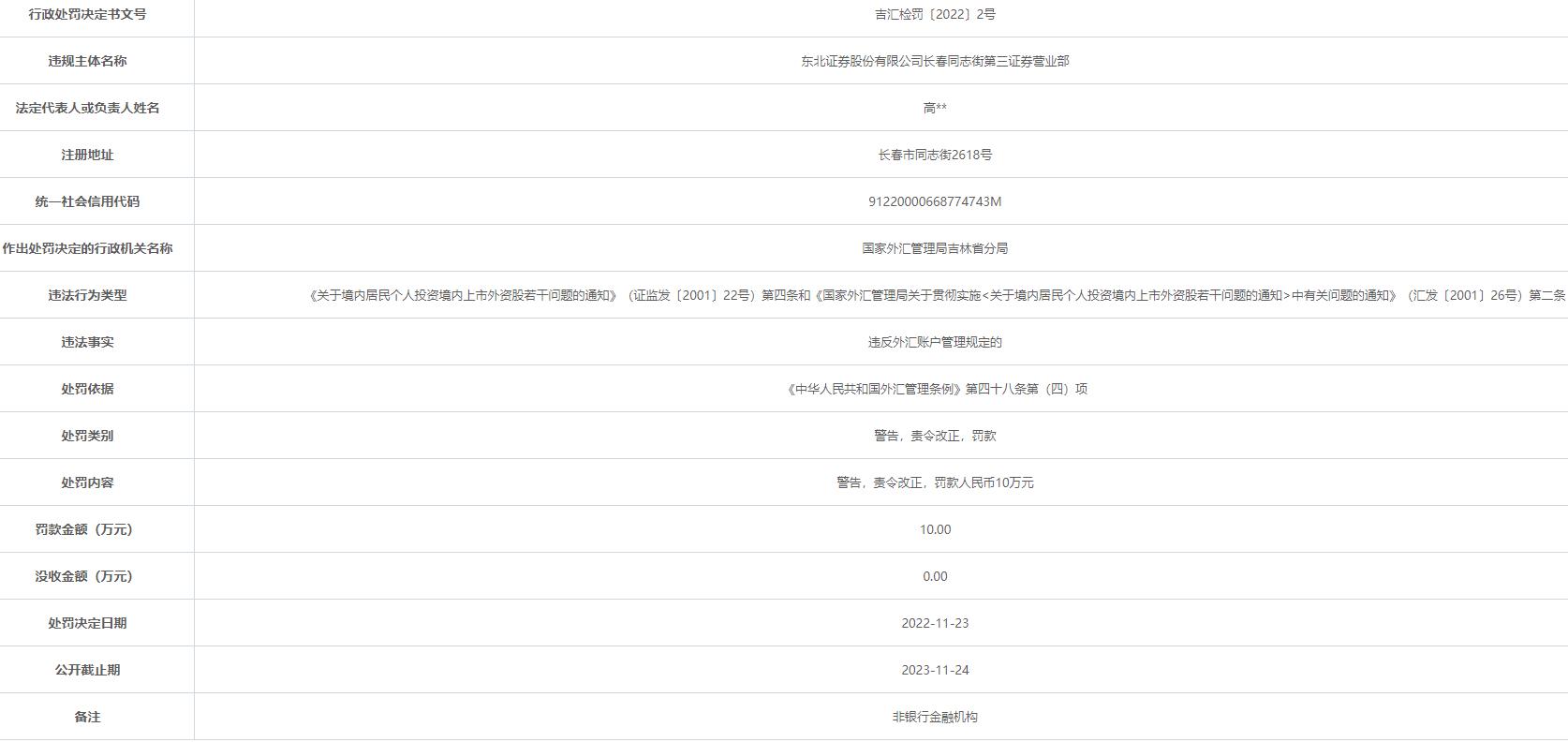 此外,行政处罚决定书(吉汇检罚〔2022〕3号)显示,东北证券股份有限公司长春前进大街证券营业部存在违反外汇账户管理规定的违法事实,违反了《关于境内居民个人投资境内上市外资股若干问题的通知》(证监发〔2001〕22号)第四条和《国家外汇管理局关于贯彻实施<关于境内居民个人投资境内上市外资股若干问题的通知>中有关问题的通知》(汇发〔2001〕26号)第二条规定,国家外汇管理局吉林省分局依据《中华人民共和国外汇管理条例》第四十八条第(四)项规定,对其警告,责令改正,罚款人民币10万元。处罚决定日期2022年11月23日。