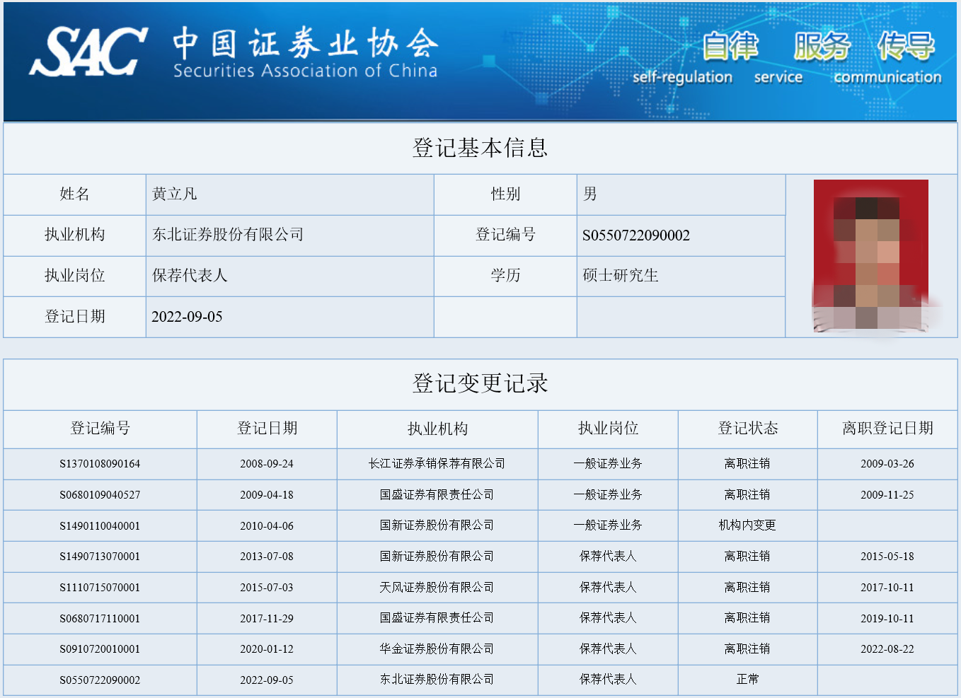 黄立凡于2022年8月22日从华金证券股份有限公司离职注销;于2022年9月5日在东北证券股份有限公司登记执业。