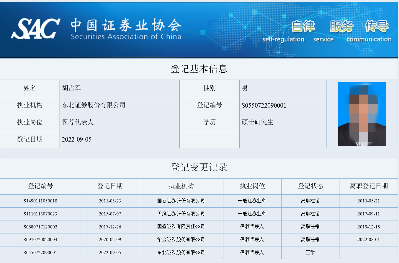 经中国经济网记者查询,胡占军于2022年8月1日从华金证券股份有限公司离职注销;于2022年9月5日在东北证券股份有限公司登记执业。