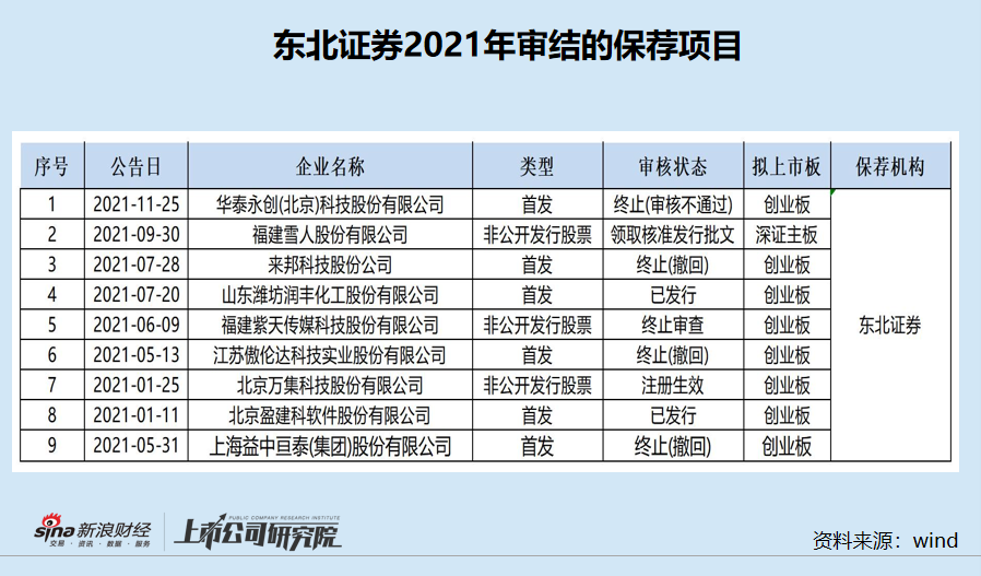 wind数据显示,东北证券2021年度审结的主板、创业板、科创板首发和再融资项目合计9家,有5家撤回或被否,保荐失败率高达55.55%。