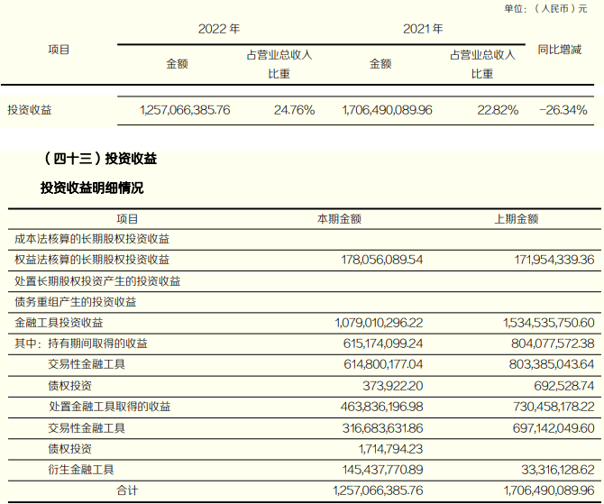 2022年,东北证券投资收益为12.57亿元,上年同期为17.06亿元,同比下降26.34%。