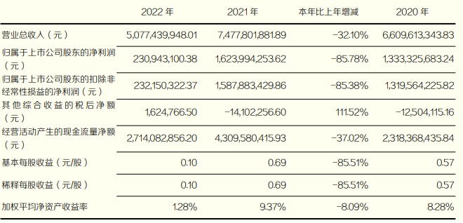 东北证券近日发布2022年年度报告,公司2022年实现营业总收入50.77亿元,同比下降32.10%;归属于上市公司股东的净利润为2.31亿元,同比下降85.78%;归属于上市公司股东的扣除非经常性损益的净利润为2.32亿元,同比下降85.38%;经营活动产生的现金流量净额为27.14亿元,同比减少37.02%。
