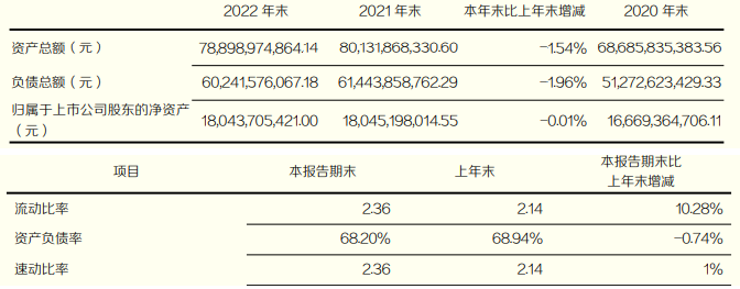 截至2022年末,东北证券资产总额为788.99亿元,同比减少1.54%;负债总额为602.42亿元,同比减少1.96%;资产负债率为68.20%,比上年同期下降0.74个百分点。