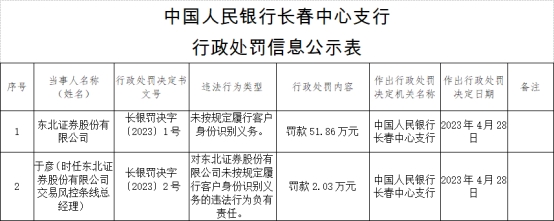 中国经济网北京5月9日讯央行网站近日公布的中国人民银行长春中心支行行政处罚信息公示表(长银罚决字〔2023〕1号、2号)显示,东北证券股份有限公司(证券代码:000686.SZ)未按规定履行客户身份识别义务。中国人民银行长春中心支行对其罚款51.86万元。