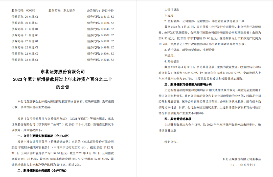 5月9日晚间,东北证券发布公告称,截至2023年4月30日,公司借款余额为281.78亿元,年内增加55.05亿元,累计新增借款占2022年末净资产(186.57亿元)比例为29.51%,超过20%。