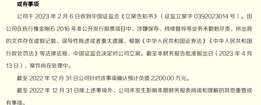 这是什么情况?行家查看了“或有事项”章节,其中提及因在豫金刚石2016年非公开发行项目中涉嫌未勤勉尽责,出具的文件存在虚假记载、误导性称述或重大遗漏,证监会于今年2月对东北证券立案。可能是为应对后续投资者索赔事项,东北证券对此确认预计负债2200万元。