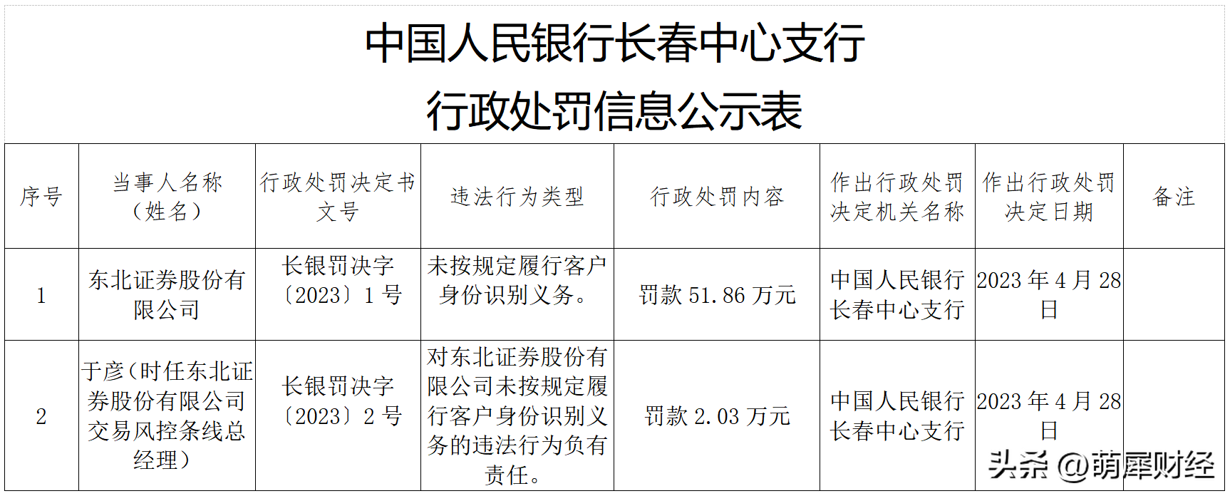 据人民银行长春中心支行网站消息,近日,因未按规定履行客户身份识别义务,东北证券被罚款51.86万元。另外,时任该公司交易风控条线总经理于彦被罚款2.03万元。