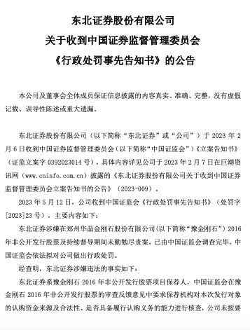 5月14日,东北证券股份有限公司(以下简称“东北证券”或“公司”)发布关于收到中国证券监督管理委员会(以下简称“中国证监会”或“证监会”)《行政处罚事先告知书》的公告。公告称,公司于5月12日收到证监会《行政处罚事先告知书》,东北证券涉嫌在郑州华晶金刚石股份有限公司(以下简称“豫金刚石”)2016年非公开发行股票及持续督导期间未勤勉尽责案,已由中国证监会调查完毕,证监会依法拟对公司作出行政处罚。