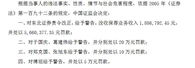 一、对东北证券责令改正,给予警告,没收保荐业务收入1886792.45元,并处以5660377.35元罚款;