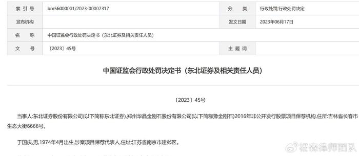 2023年6月17日,中国证监会对东北证券及相关责任人员作出行政处罚。