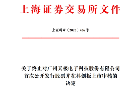 2023年7月6日,天极科技和保荐人东北证券股份有限公司分别向上交所提交了《广州天极电子科技股份有限公司关于撤回首次公开发行股票并在科创板上市申请文件的申请》(天极科技[2023]第21号)和《东北证券股份有限公司关于撤回广州天极电子科技股份有限公司首次公开发行股票并在科创板上市申请文件的申请》(东证投行发[2023]82号),申请撤回申请文件。根据《上海证券交易所股票发行上市审核规则》第六十三条的有关规定,上交所决定终止对天极科技首次公开发行股票并在科创板上市的审核。