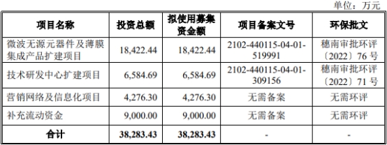 天极科技原拟在上交所科创板公开发行的股份数量为2,000万股,占发行后公司总股本的比例不低于25%(不考虑超额配售选择权,不涉及老股转让)。公司原拟募集资金38,283.43万元,分别用于微波无源元器件及薄膜集成产品扩建项目、技术研发中心扩建项目、营销网络及信息化项目、补充流动资金。