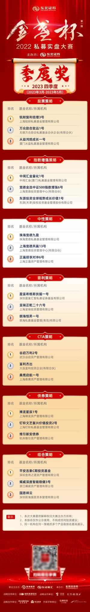 为推动私募行业高质量发展,赋能优秀私募管理人成长,由东北证券(000686)主办,渤海期货、东证融汇联合主办,私募排排网承办,国投泰康信托提供战略支持,迅投、卡方科技、艾科朗克、非凸科技提供战略合作的全国性私募赛事——2022年第一届“金盏杯”私募实盘大赛在去年6月1日盛大启动开赛,迄今赛期持续一年,并于5月31日结束比拼,大赛第四赛季获奖名单也如期重磅出炉。
