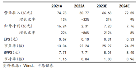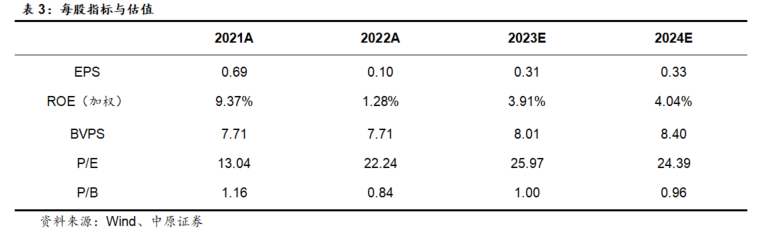 预计公司2023、2024年EPS分别为0.31元、0.33元,BVPS分别为8.01元、8.40元,按8月25日收盘价8.05元计算,对应P/B分别为1.00倍、0.96倍,维持“增持”的投资评级。