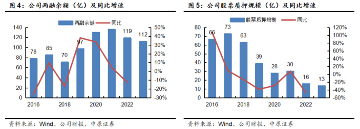 股票质押业务方面,截至报告期末,公司以自有资金作为融出方参与股票质押的待购回余额13.48亿元,较2022年底-14.95%。