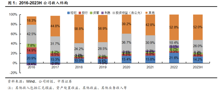 2023H公司经纪、投行、资管、利息、投资收益(含公允价值变动)和其他业务净收入占比分别为14.2%、4.0%、3.6%、0.2%、26.0%、52.0%,2022年分别为21.6%、3.3%、6.7%、5.1%、10.4%、52.8%。