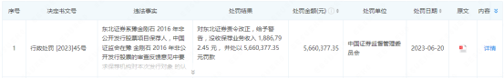 值得一提的是,6月20日,行政处罚[2023]45号东北证券因在持续督导期间未勤勉尽责,公司出具的2016年至2018年度相关持续督导及现场检查报告存在虚假记载,被中国证券监督管理委员会处以 566万元罚款。
