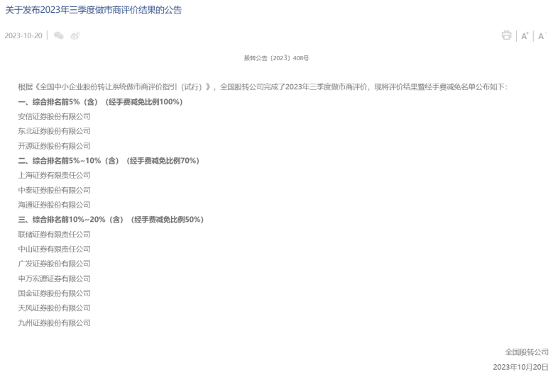 来自全国中小企业股份转让系统有限责任公司(简称:全国股转公司)最新公告,披露了13家获得2023年三季度做市交易经手费减免资格的券商——安信证券、东北证券和开源证券继续获得全免。