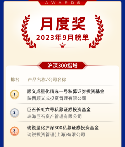 9月沪深300指增组的冠军是陕西顺义成投资管理有限公司的顺义成量化精选一号私募证券投资基金。顺义成投资成立于2014年,办公点位于西安,核心策略为股票策略和多资产策略,管理规模在0-5亿,在管基金数量7只。该获奖产品基金经理为程晓玮,其深耕期货、股票交易十余年;擅长数据分析、创建交易模型,负责Alpha量化策略、可转债T0策略的研发。