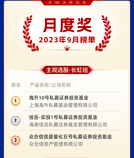 上海海升私募基金管理有限公司的海升10号私募证券投资基金夺得了9月主观选股-长虹组的冠军。海升基金是一家专注于量化与固收+的阳光私募基金。公司长期深耕量化与固收领域,在量化多头市场中性,CTA,“固收+复合”领域,均表现不错。公司核心理念是以控制风险为核心目标,在不同市场情况下,以全天候策略持续为投资人创造价值。