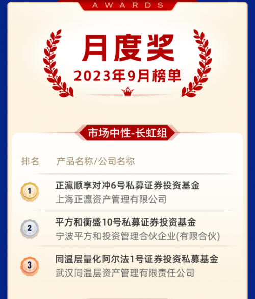 上海正瀛资产管理有限公司的正瀛顺享对冲6号私募证券投资基金是9月市场中性-长虹组的冠军。正瀛资产专注于资本市场,致力于为优秀的投资经理配备一流的研究支持、渠道资源、品牌背书、资本对接和运营维护,打造以人为本的企业文化和扁平化的组织架构,让优秀的投资经理专注于投资,全力以赴地为投资者创造更佳的收益,目标是成为国内顶级的期权交易公司。目前产品涉及股票、期货、债券和金融衍生品。