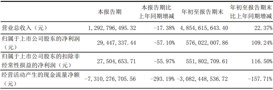 其中第三季度,东北证券营业总收入为12.93亿元,同比下降17.38%;归属于上市公司股东的净利润为2944.73万元,同比下降57.10%;归属于上市公司股东的扣除非经常性损益的净利润为2750.47万元,同比下降55.97%;经营活动产生的现金流量净额为-73.10亿元,同比变动比例为-293.19%。