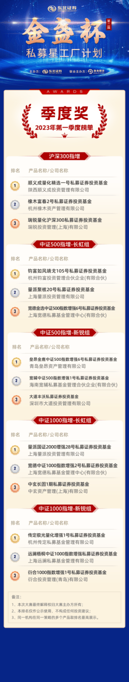 在这样频繁切换的市场环境下,获取收益的机会更多依靠的是阿尔法和贝塔收益,考验的也是基金管理人的选股能力。在近期激烈角逐的东北证券(000686)第二届“金盏杯”私募星工厂计划中,不少私募管理人一路过关斩将,逆势取得优异的成绩。下面我们将共同揭晓本届“金盏杯”私募星工厂计划第一季度(2023年9-11月)获奖名单。