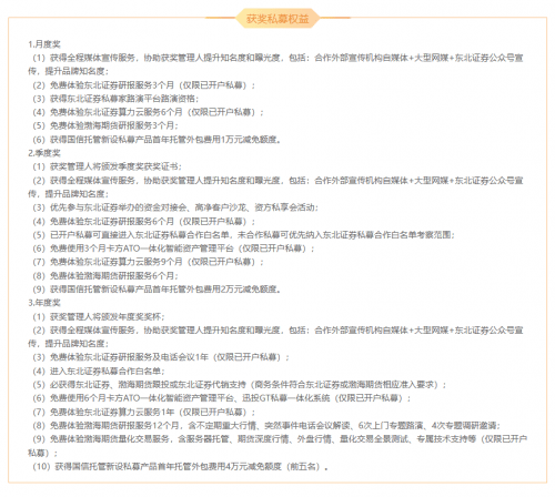 为体现东北证券对私募机构的诚意,主办方东北证券为满足报名要求的私募管理人提供多重服务与支持。各规模组别细分策略中的获奖私募亦有机会享有东北证券设置的月度奖、季度奖、年度奖项,以及相对应的获奖私募权益。