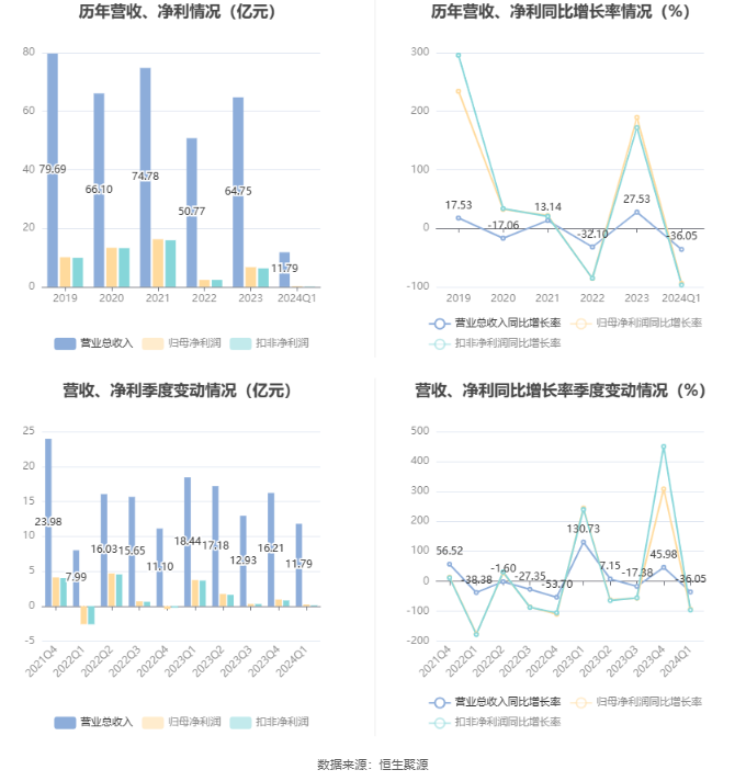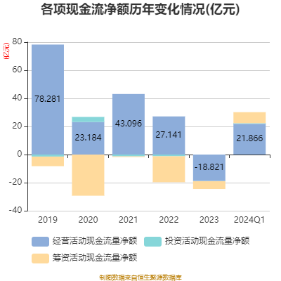 2024年第一季度,公司经营活动现金流净额为21.87亿元,同比增加47.13亿元;筹资活动现金流净额7.85亿元,同比减少12.02亿元;投资活动现金流净额4522.89万元,上年同期为-1.11亿元。