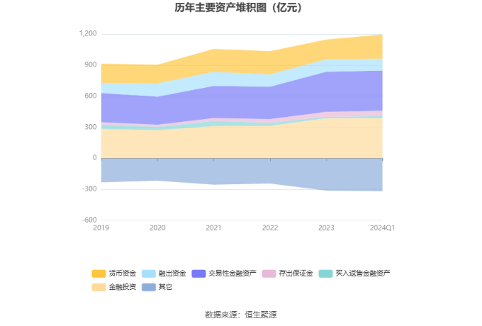 资产重大变化方面,截至2024年一季度末,公司货币资金较上年末增加23.82%,占公司总资产比重上升3.99个百分点;金融投资较上年末增加0.06%,占公司总资产比重下降2.33个百分点;交易性金融资产较上年末增加0.06%,占公司总资产比重下降2.32个百分点;结算备付金较上年末减少42.33%,占公司总资产比重下降1.88个百分点。