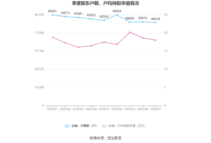 筹码集中度方面,截至2024年一季度末,公司股东总户数为8.82万户,较上年末下降了781户,降幅0.88%;户均持股市值由上年末的18.67万元下降至18.06万元,降幅为3.27%。