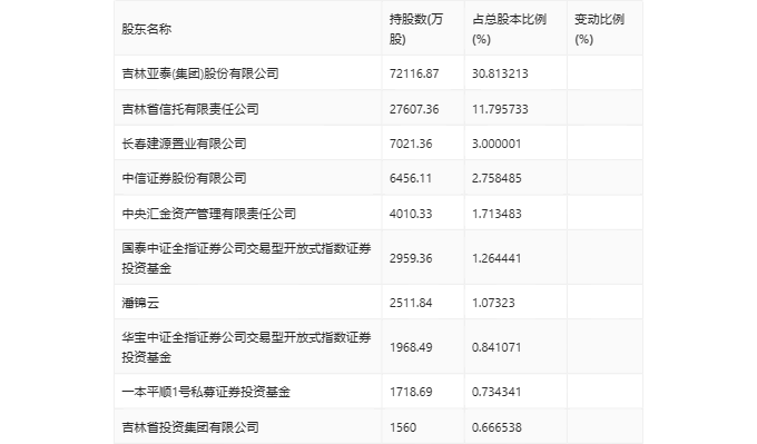 一季报显示,2024年一季度末公司十大流通股东中,新进股东为吉林省投资集团有限公司,取代了上年末的香港中央结算有限公司。在具体持股比例上,一本平顺1号私募证券投资基金持股有所上升,中信证券股份有限公司、国泰中证全指证券公司交易型开放式指数证券投资基金、华宝中证全指证券公司交易型开放式指数证券投资基金持股有所下降。