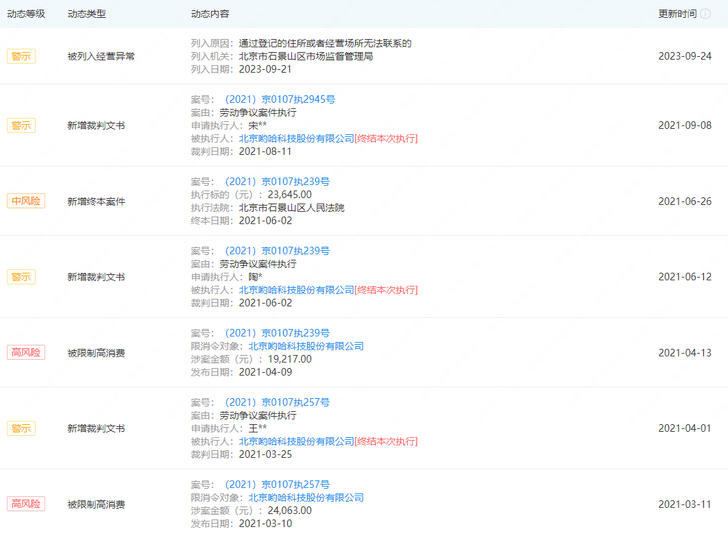 哟哈股份有多起限高和终本案件信息,并且已被列入经营异常。