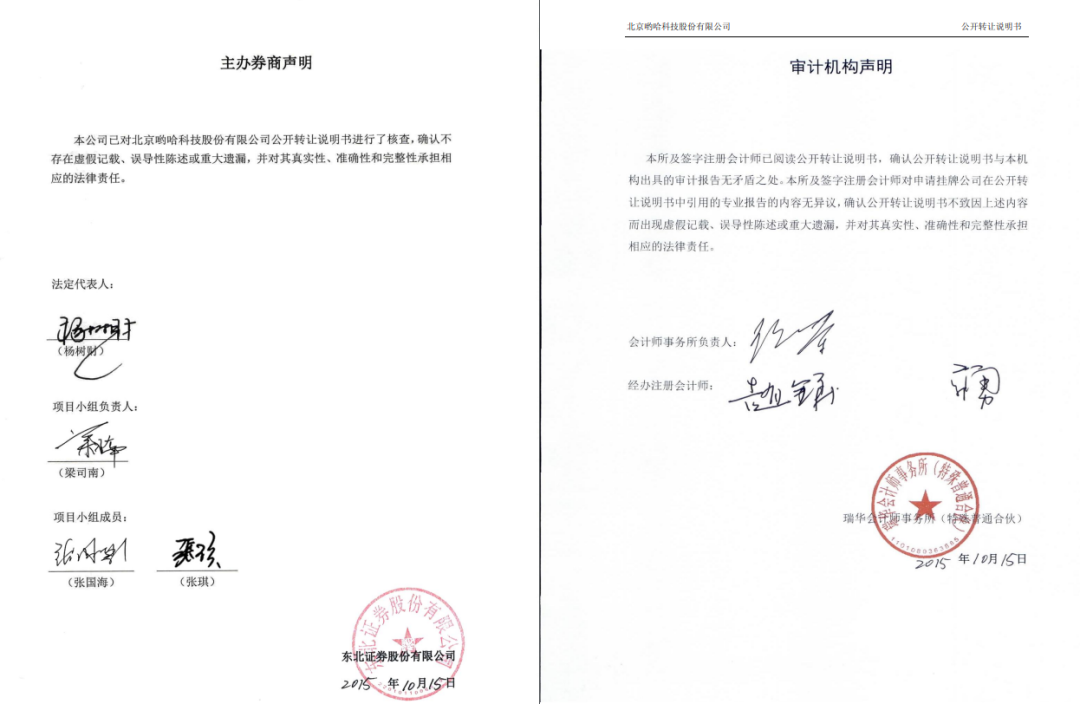 股转公司列示的历史文件显示,东北证券于2015年10月15日签署了《关于推荐北京哟哈科技股份有限公司股票进入全国中小企业股份转让系统挂牌的推荐报告》《公开转让说明书》等文件。