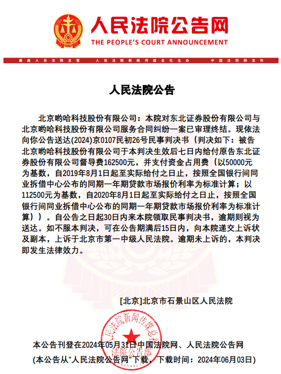 据人民法院公告网显示,北京市石景山人民法院近期公告送达东北证券股份有限公司(简称:东北证券)与北京哟哈科技股份有限公司(简称:哟哈股份)服务合同纠纷案的判决结果。