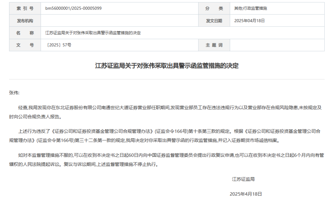 为此,江苏证监局对东北证券南通营业部和两任负责人,分别采取出具警示函的行政监管措施,并记入证券期货市场诚信档案。