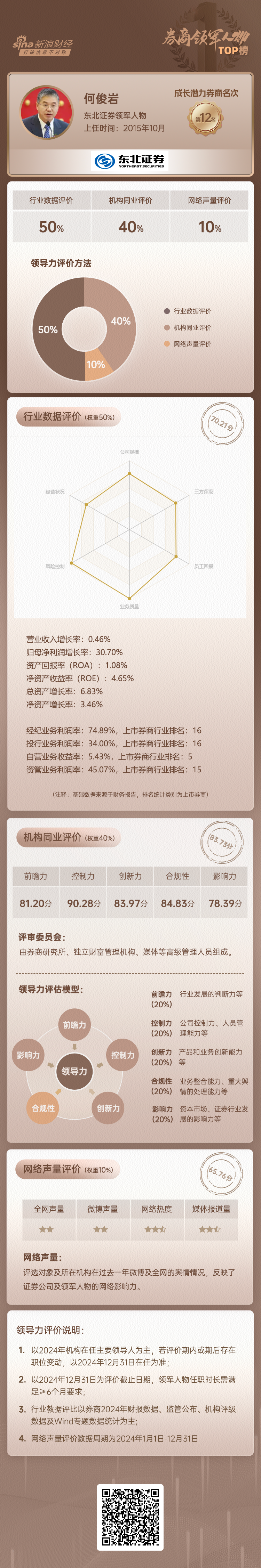 2024年,何俊岩先生领导下的东北证券综合评分位于成长发展券商第12名,而其中网络声量评价分数相对较低。分维度来看: