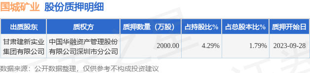 国城矿业(000688)10月10日公开信息显示,股东甘肃建新实业集团有限公司向中国华融资产管理股份有限公司深圳市分公司合计质押2000.0万股,占总股本1.79%。质押详情见下表: