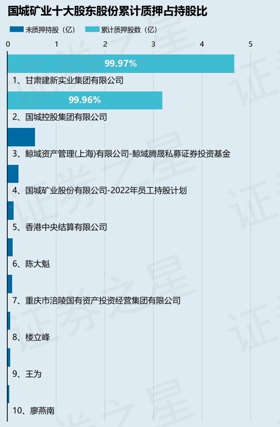 截止本公告日,股东甘肃建新实业集团有限公司已累计质押股份4.66亿股,占其持股总数的99.97%,股东国城控股集团有限公司已累计质押股份3.18亿股,占其持股总数的99.96%。本次质押后国城矿业十大股东的累计质押股份占持股比例见下图: