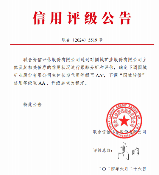 联合资信近期发布信用评级公告称,下调国城矿业主体长期信用等级至AA-,下调“国城转债”信用等级至AA-,评级展望为稳定。