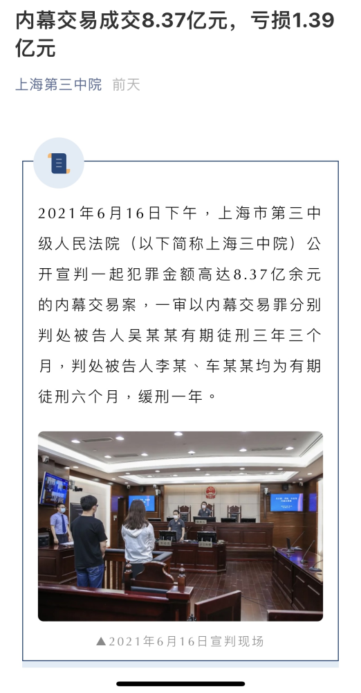 6月16日下午,上海市第三中级人民法院(以下简称上海三中院)公开宣判一起犯罪金额高达8.37亿余元的内幕交易案,一审以内幕交易罪分别判处被告人吴某某有期徒刑三年三个月,判处被告人李某、车某某均为有期徒刑六个月,缓刑一年。