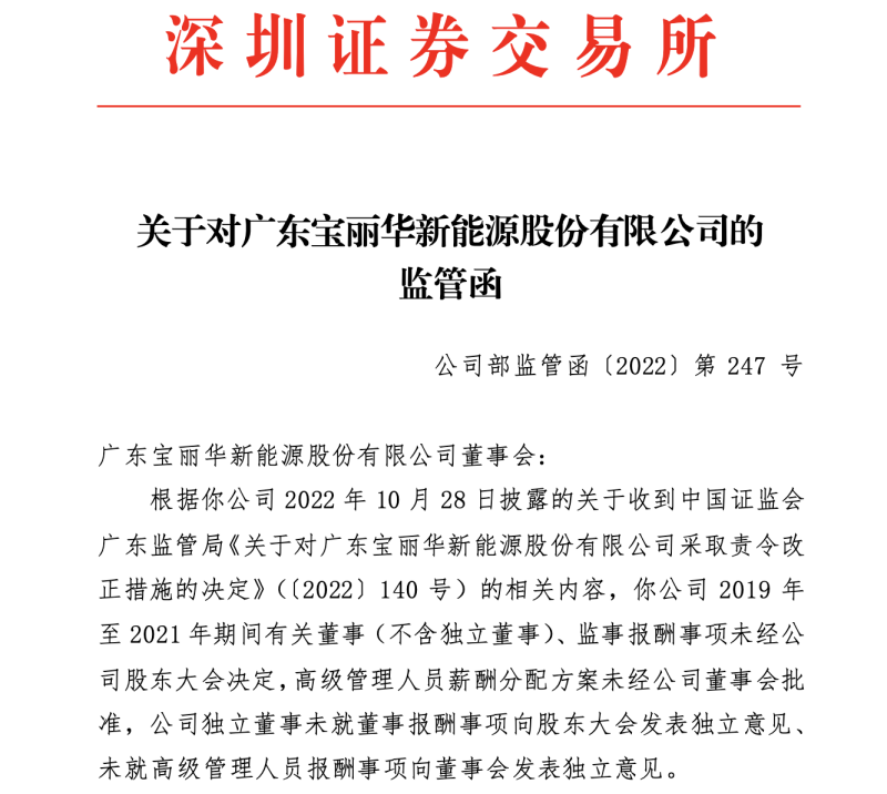 此前在10月28日公告中,宝新能源已经收到广东证监局行政监管措施决定书,在对上市公司现场检查中发现相关薪酬事项违规行为,广东证监局对宝新能源采取责令改正的行政监管措施。同时要求公司应高度重视,对上述问题进行限期整改,并举一反三,建立完善公司及子公司薪酬管理制度。