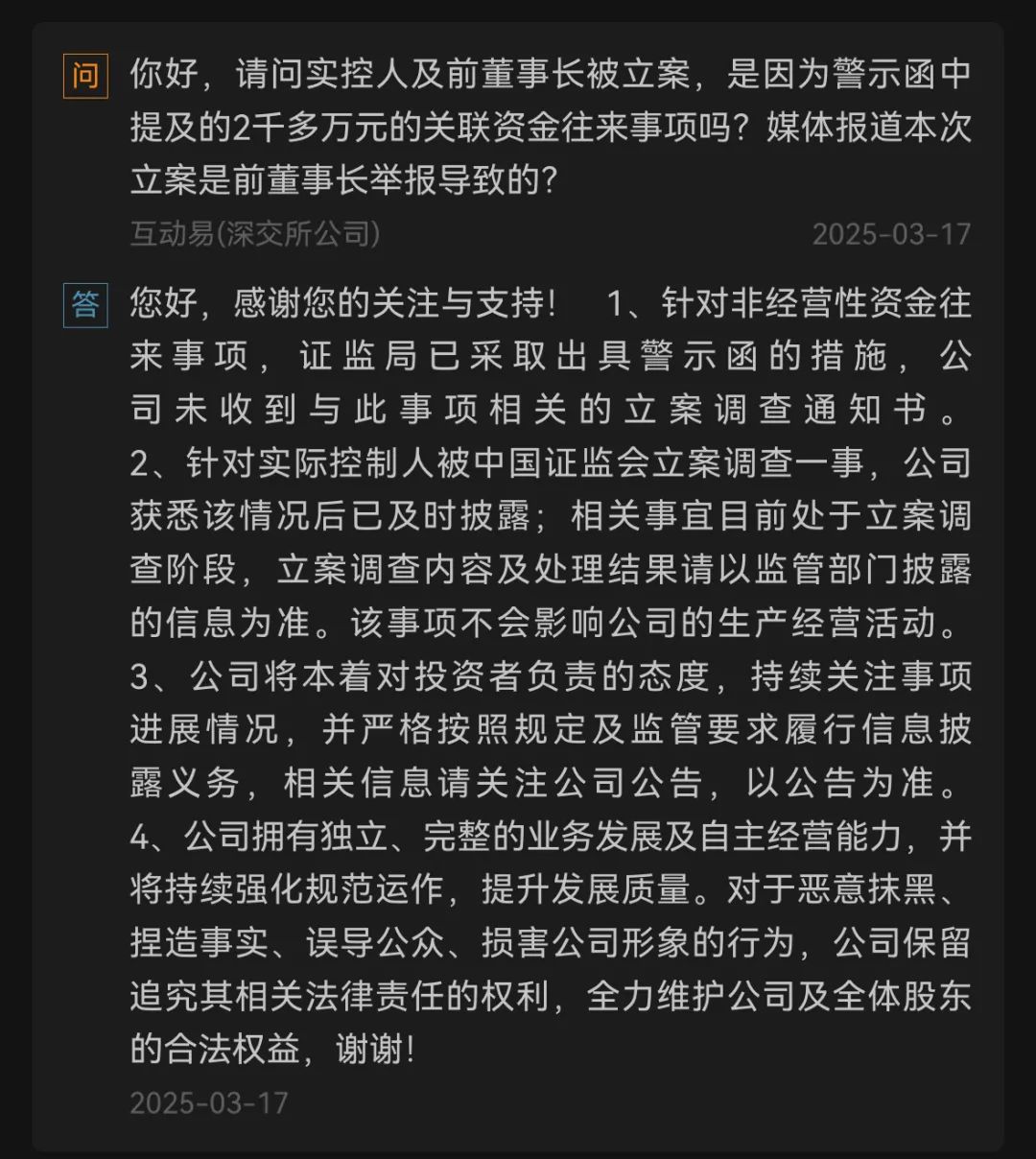 首先从本质上说,警示函和立案调查不太一样,是一种行政监管措施,往往代表一个案子的结论。针对这两个公告的关系,公司做了如下的回复。读下来的感觉是,公司并没有完全解释清楚这两件事到底有没有关系,或者有何种程度的关系。很大程度上是由于“实控人被证监会立案调查”还处于调查阶段,相关信息和结果还没有在监管部门披露。